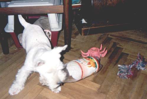 У Феньчика гора игрушек, но грохотать по квартире пластиковой бутылкой или тренажером (типа эспандера) - это святое! Особенно она обожает на всем лету врываться с тренажером или бутылкой в бокс - и выскакивать оттуда. Тренажер для бокса великоват, и когда он застревает на входе или выходе, наша хулиганка в восторге рычит (как говорит моя бабушка, "серчает" :)) и удваивает усилия по протаскиванию верблюдов в угольное ушко.