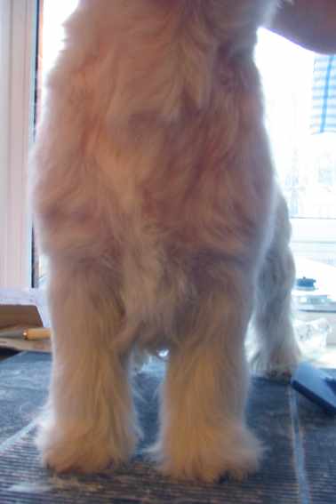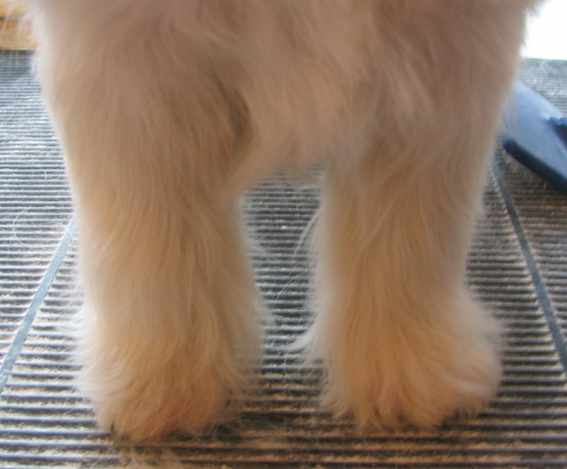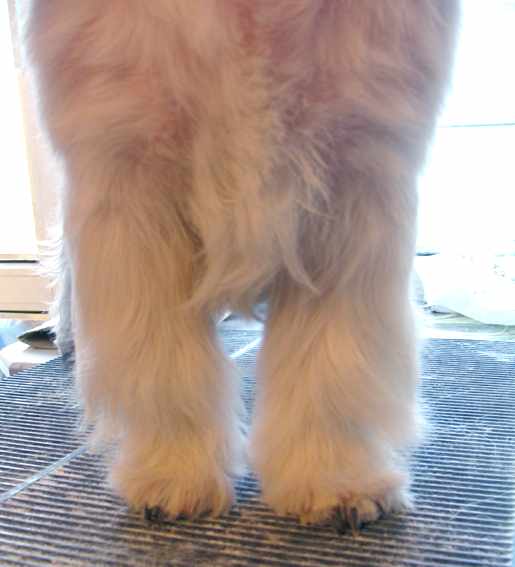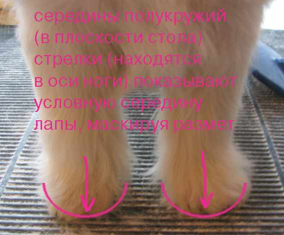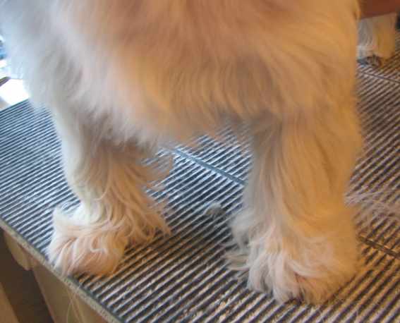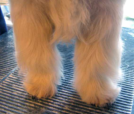 "Столбики" сформированы, теперь, начесав шерсть на лапах вниз, подстригаем лапы внизу.