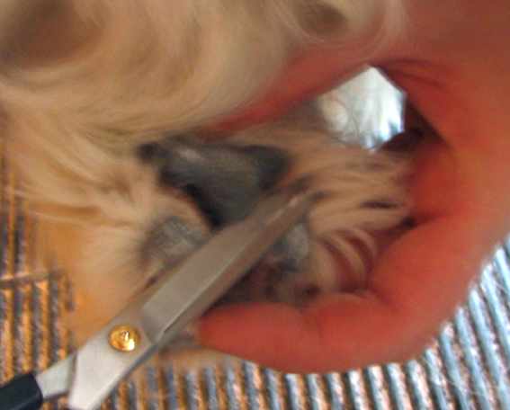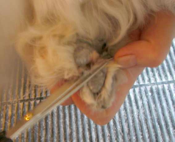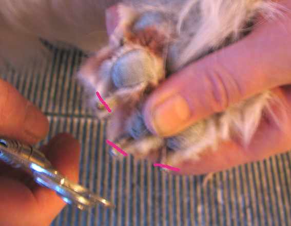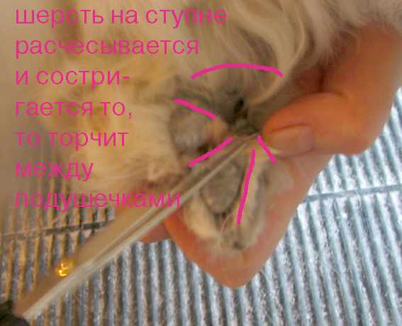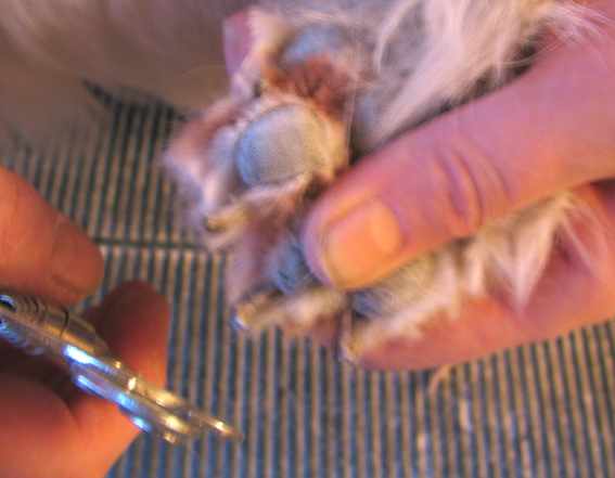 Ножницы желательно держать остриями наружу, лезвиями в плоскости лапы. Тщательно выстригите, если есть, спутавшуюся шерсть между пальцами.
