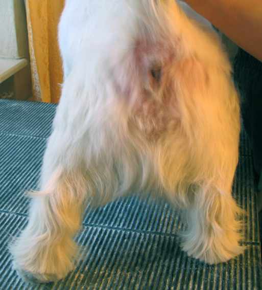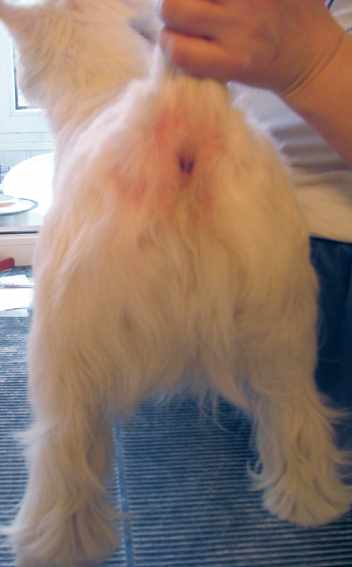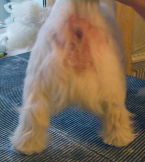 Сзади шерсть пока прощипана вокруг анального отверстия. Если подщипывать шерсть достаточно часто, то под слоем выщипанной шерсти будет лежать слой более короткой, плотно прилегающей "новенькой" шерсти. Здесь, поскольку собака тримминговалась три месяца назад, осталось немного подшерстка и "отсвечивает" розовая кожа.