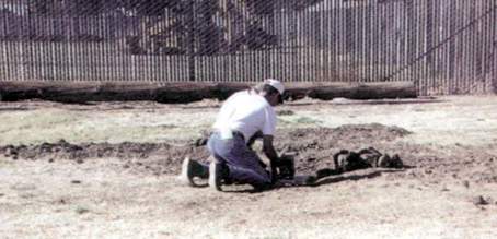 На глазах участников испытаний площадку огородили оранжевой легкой пластиковой сеткой на тонких колышках. Внутри огороженной площадки трое мужчин выкопали траншею, установили П-образные перекрытия и присыпали их землей. Глубина траншеи 30-35 см, ровная по всей длине. Так было сооружено две небольших норы - для притравки и для испытаний. В готовом виде нора для испытаний представляет собой трубу квадратного сечения 22,5 х 22,5 см длиной 9 метров с тремя поворотами в 90 градусов. В конце норы котел, или, скажем, углубление, закрывающееся деревянной крышкой, сюда помещается ящик с "добычей". В норе имелся еще один вход, но его открывали только во время испытаний мастеров. Нора для притравки, выкопанная рядом, но на гораздо меньшей площадке, тоже огороженная сеткой, имела длину три метра и один поворот в 90 градусов. Правилами испытаний вид зверя не определяется, дается общее название - "добыча". Роль подсадного зверя "исполняли" две небольшие крысы, помещенные в деревянный ящик 20 х 20 см, одна сторона которого затянута металлической сеткой Они мирно грызли виноградные ягоды и орехи, не проявляя ни малейшего беспокойства.
